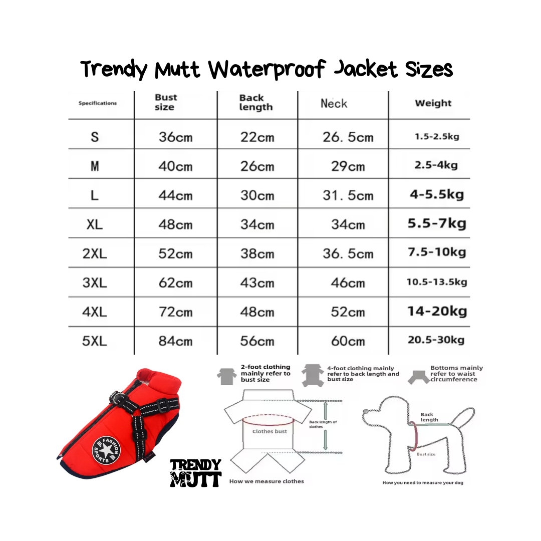 Warm waterproof dog jacket with built-in harness Size Chart – Trendy Mutt UK